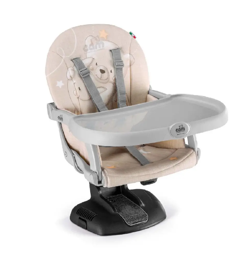 Fissaggio universale alla sedia con set di cinghie regolabili, 7 altezze (5-20 cm), spaziosa tavoletta removibile, seduta anatomica con morbida imbottitura in tessuto removibile e lavabile, cinghia a 5 punti, base con gommini antiscivolo. Chiusura ultracompatta. Borsa da viaggio.